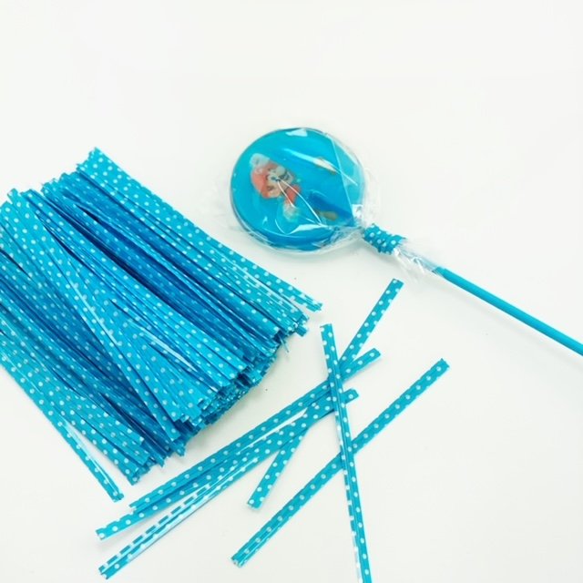 Los alambres azules con estampado de puntos son ideales para sellar bolsas de celofán, piruletas, bolsas de dulces, bolsas de fiesta, manualidades, regalos y papelería.