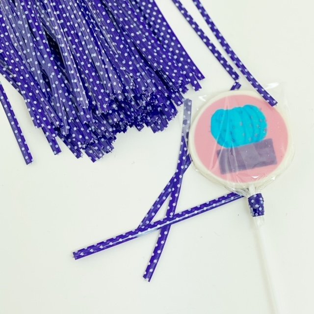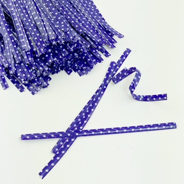 Los alambres violeta con estampado de puntos son ideales para sellar bolsas de celofán, piruletas, bolsas de dulces, bolsas de fiesta, manualidades, regalos y papelería.