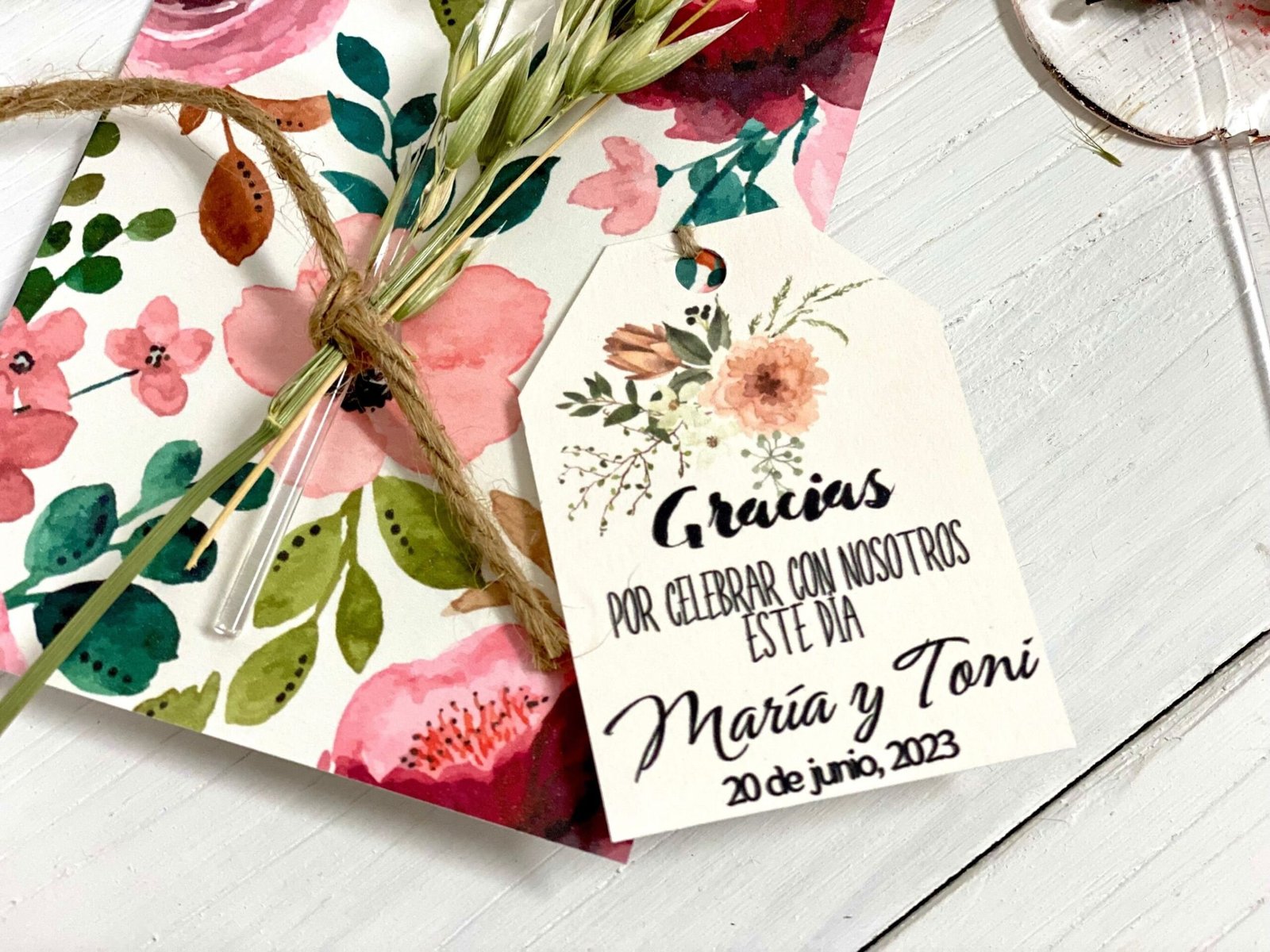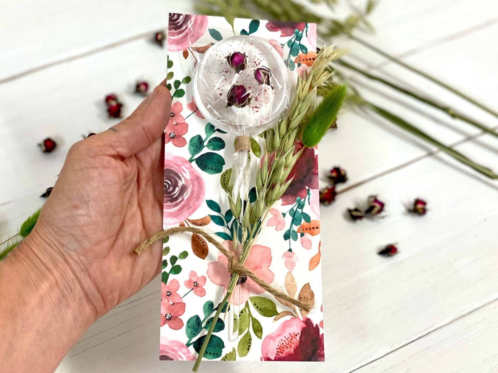 Opción completoa: Tarjeta trasera, piruleta, decoración floral y tarjeta con mensaje.