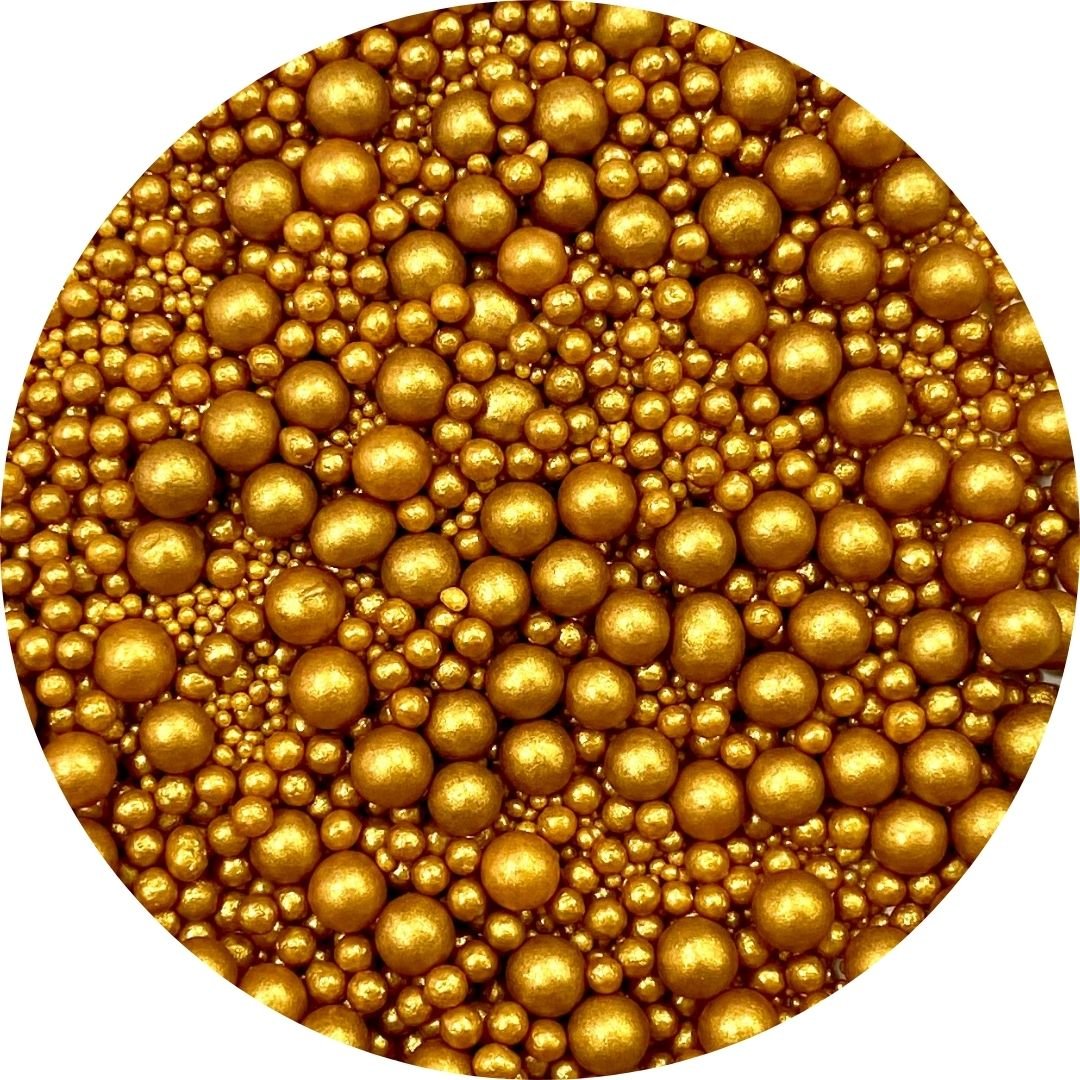 Perla oro mix son una combinación de perlas comestibles de azúcar en tres tamaños 2/ 4/ 7mm.