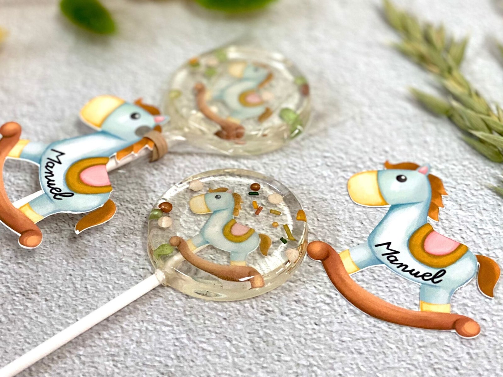 Nuestras piruletas para baby shower están hechas a mano con isomaltosa de la más alta calidad.