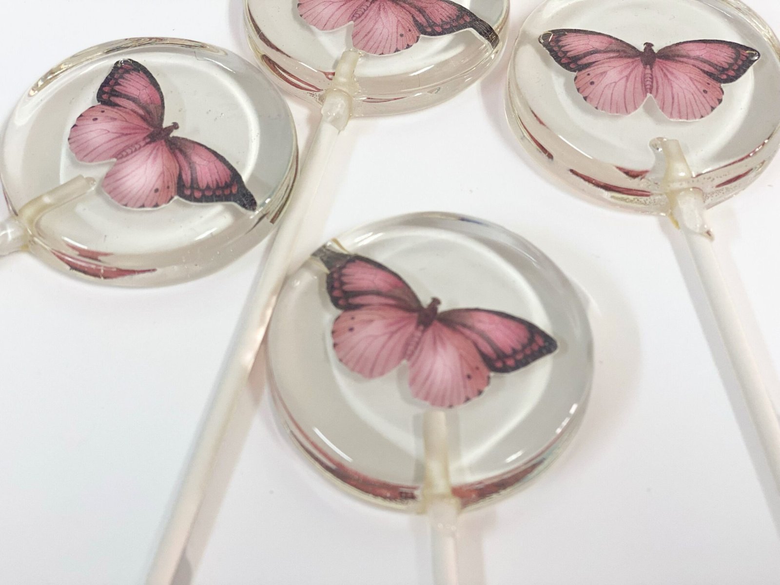 Piruletas de mariposa rosa Hard Candy hechas a mano sin azúcar