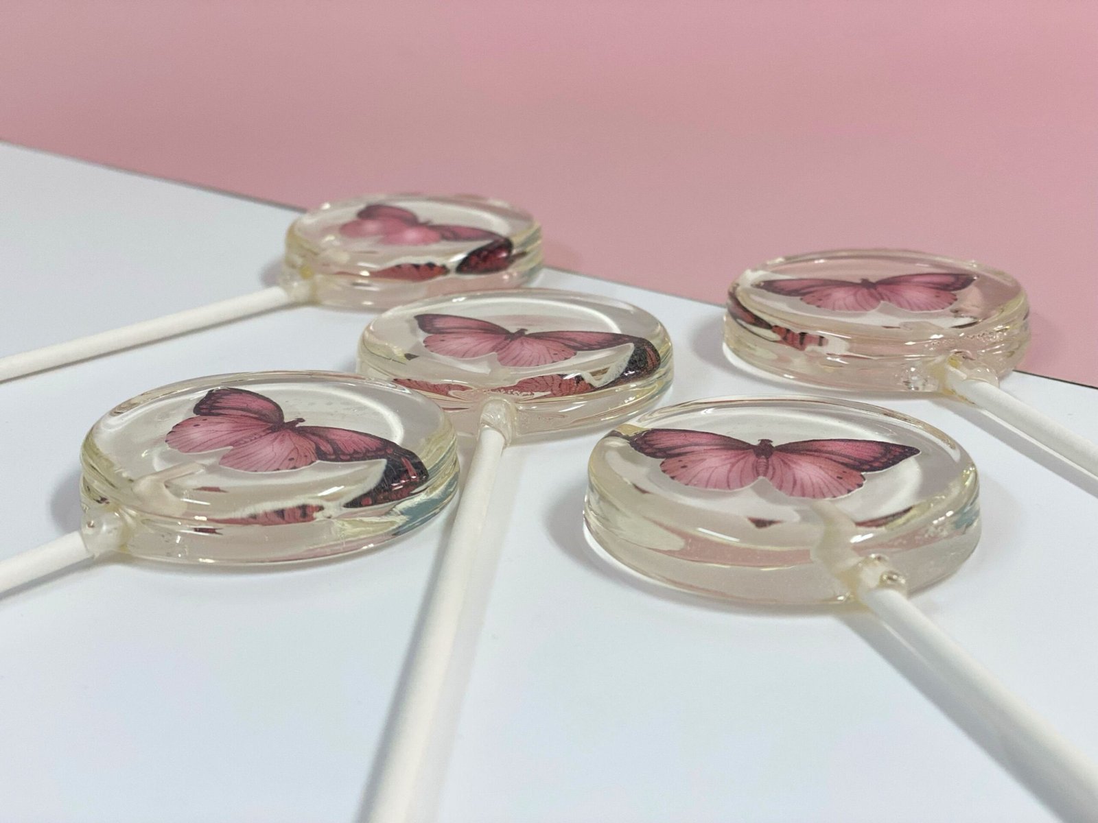 Haz tu pedido online hoy y recibe tus piruletas de isomalt con mariposas rosas comestibles en la comodidad de tu hogar. ¡Haz tu evento aún más especial con nuestras decorativas y deliciosas piruletas!