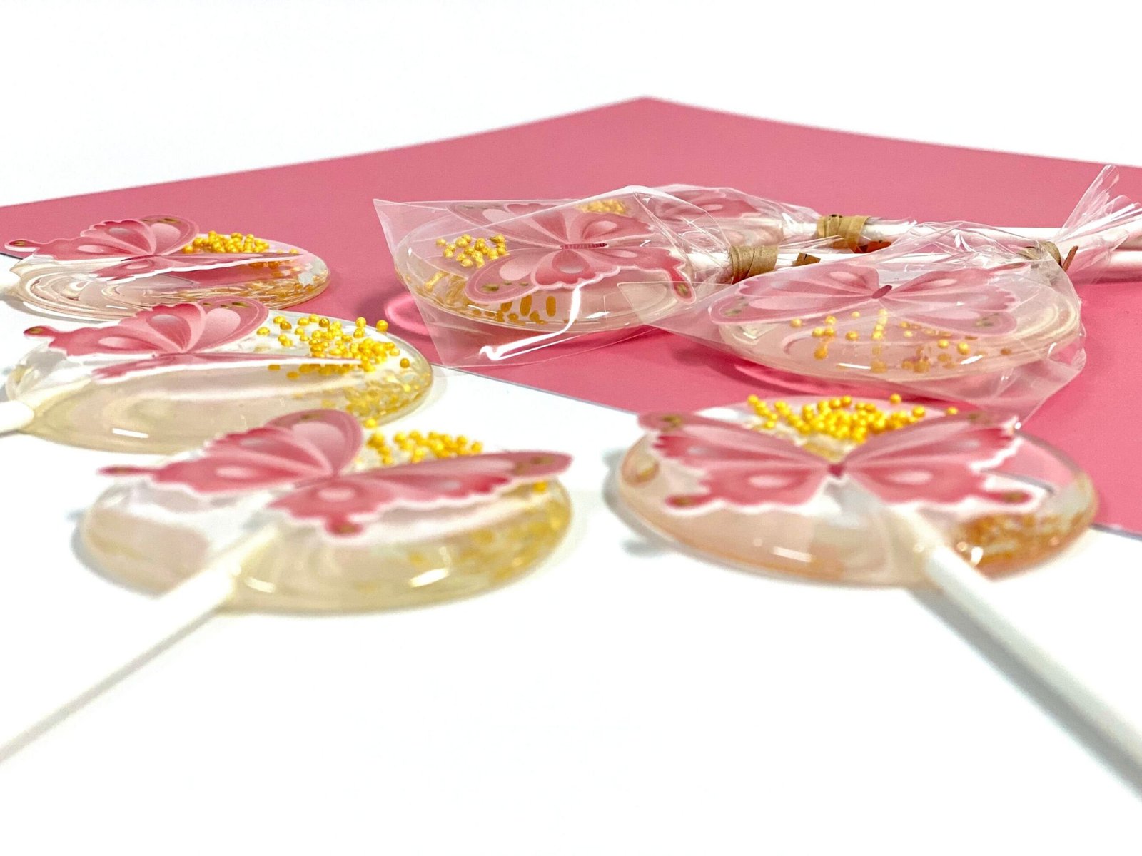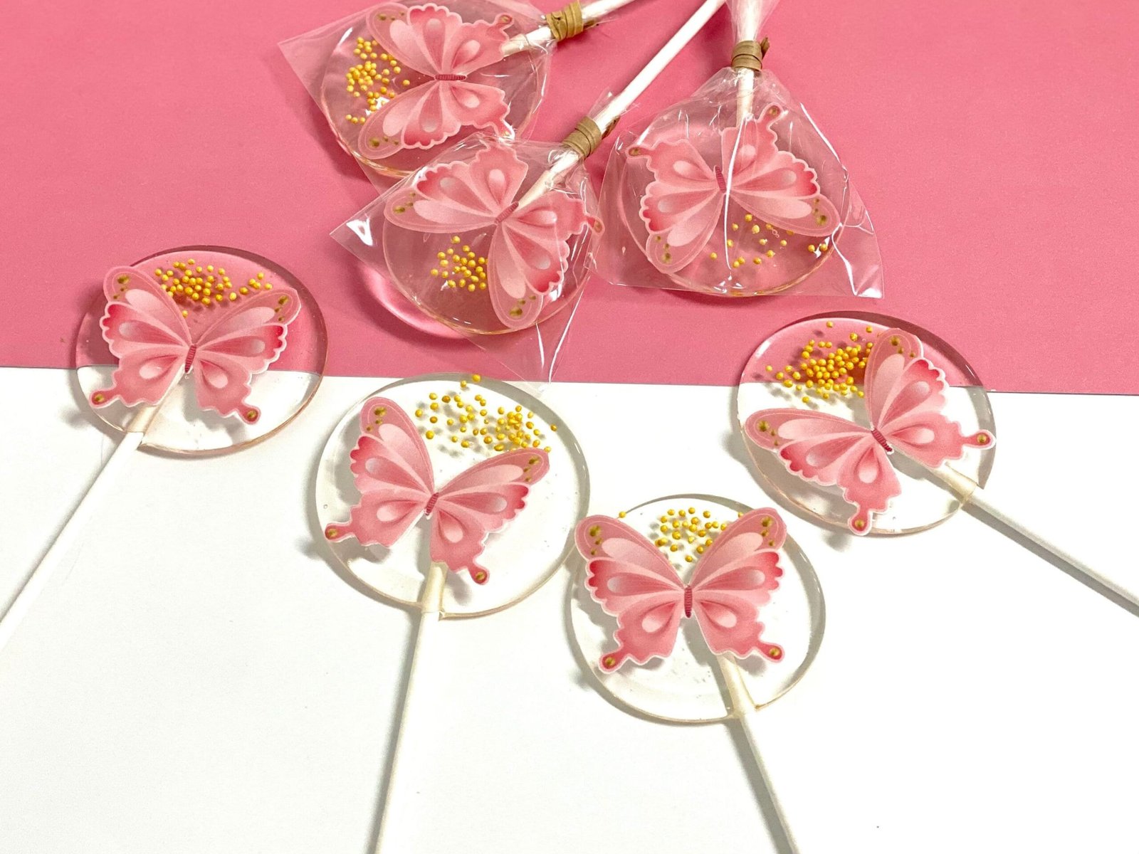 Piruletas personalizadas con mariposas rosas comestibles y chispitas doradas.