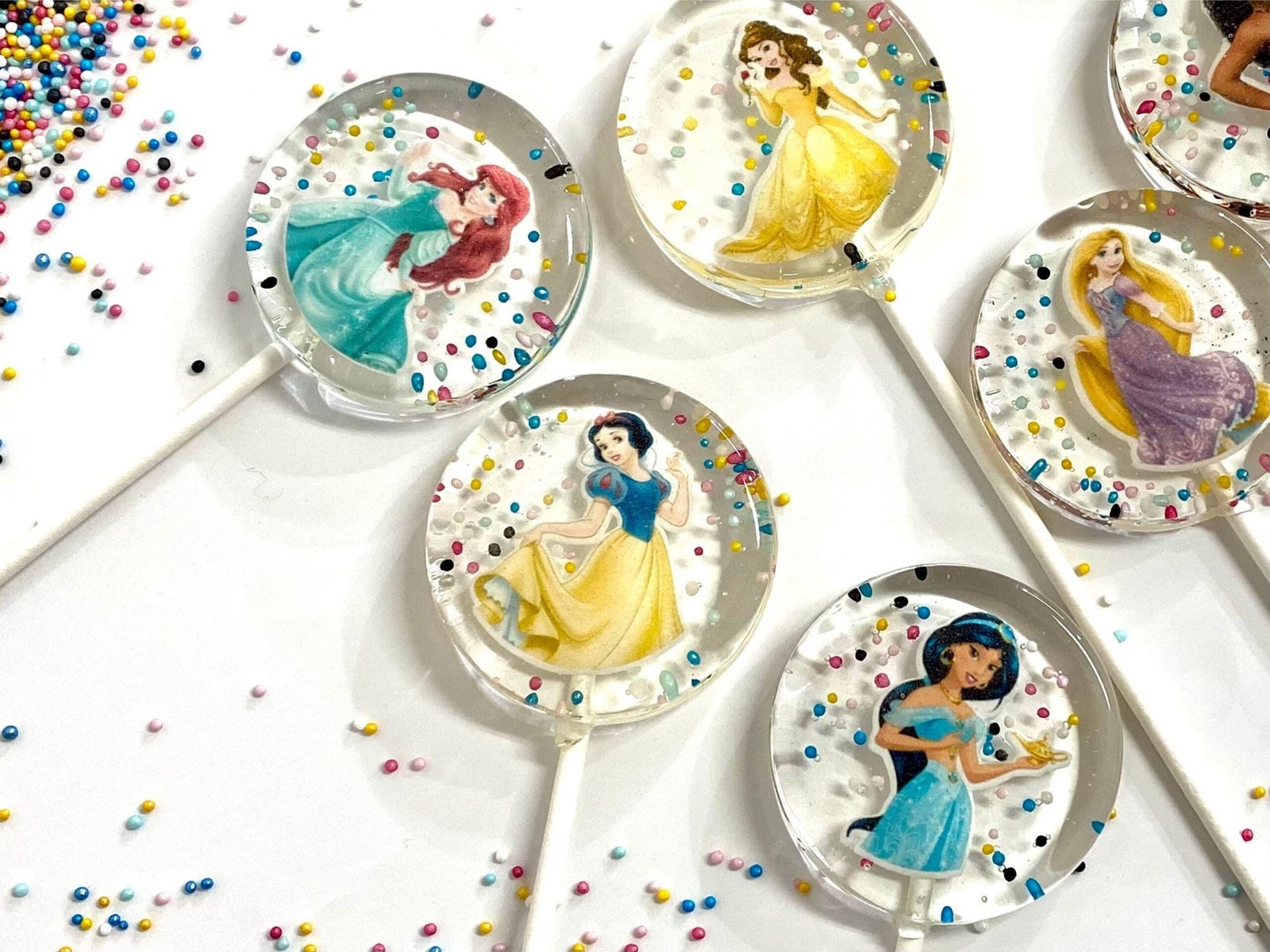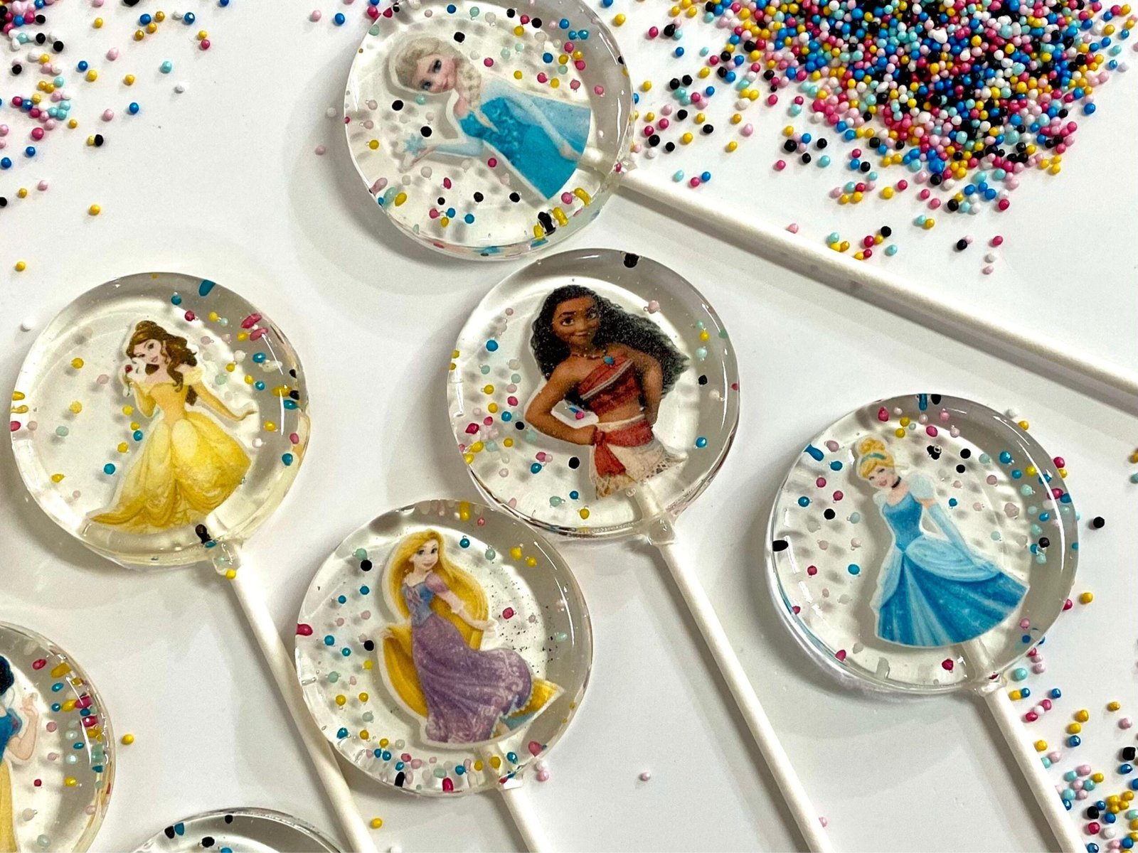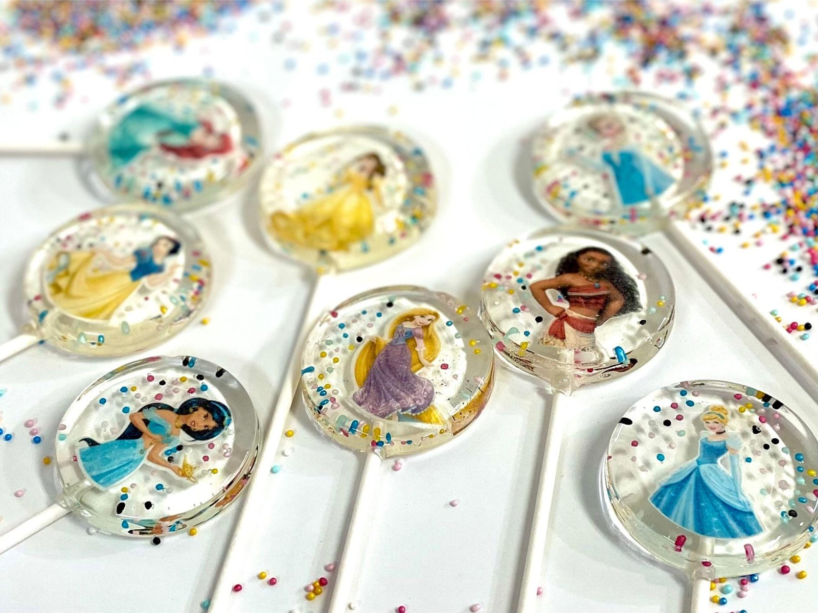 👑✨ ¡Entra en un mundo de cuento de hadas con nuestras piruletas transparentes Isomalt Disney Princess! 🍭🌟 Cada elegante piruleta muestra hermosas imágenes comestibles de queridas princesas de Disney, envueltas en isomalt cristalino para un efecto mágico similar al vidrio.