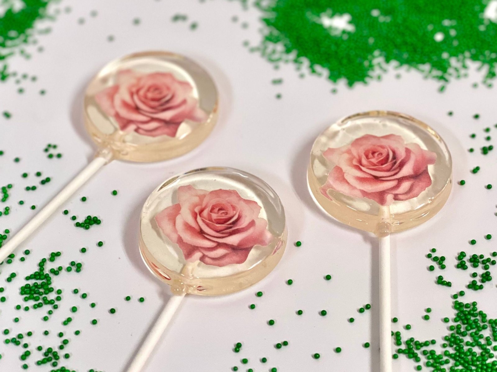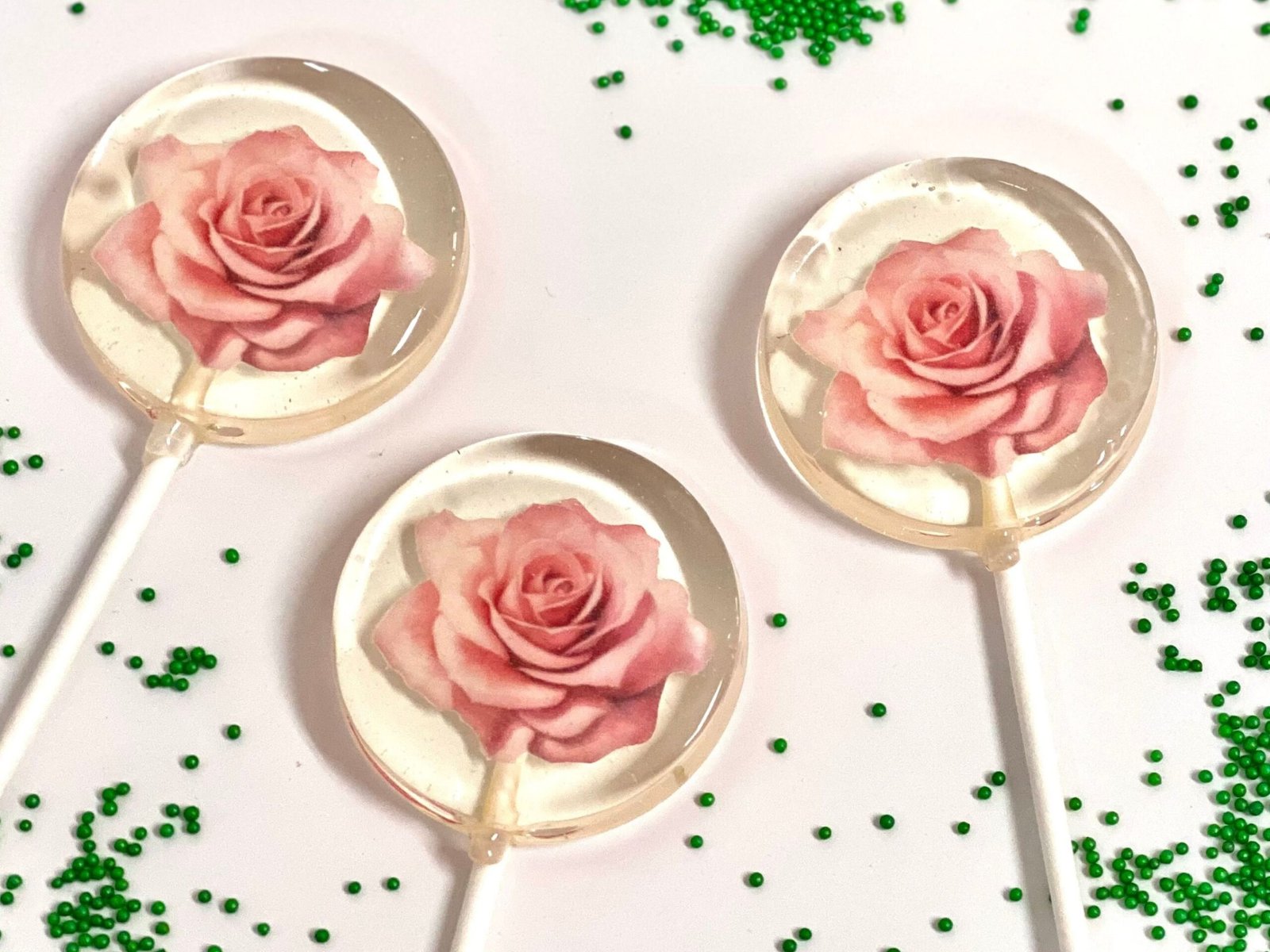 Cada piruleta presenta una fascinante rosa rosada delicadamente impresa con tinta comestible, que combina un atractivo visual con una dulzura deliciosa.