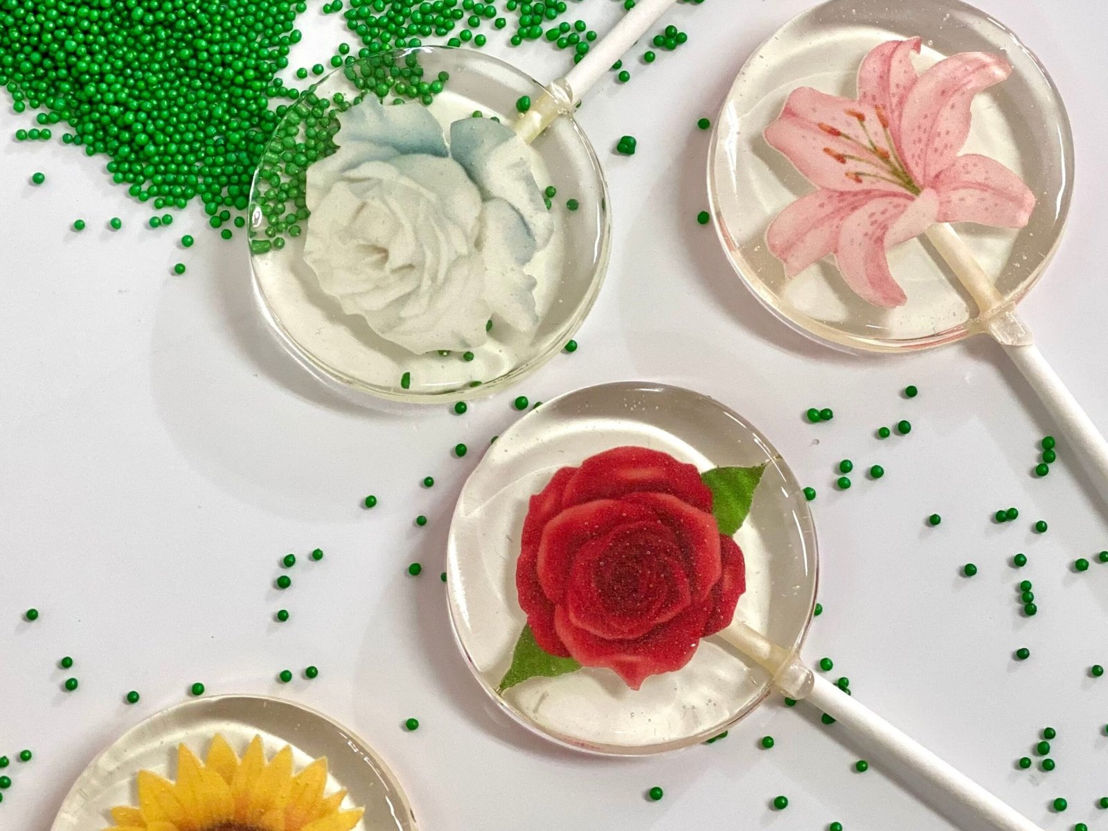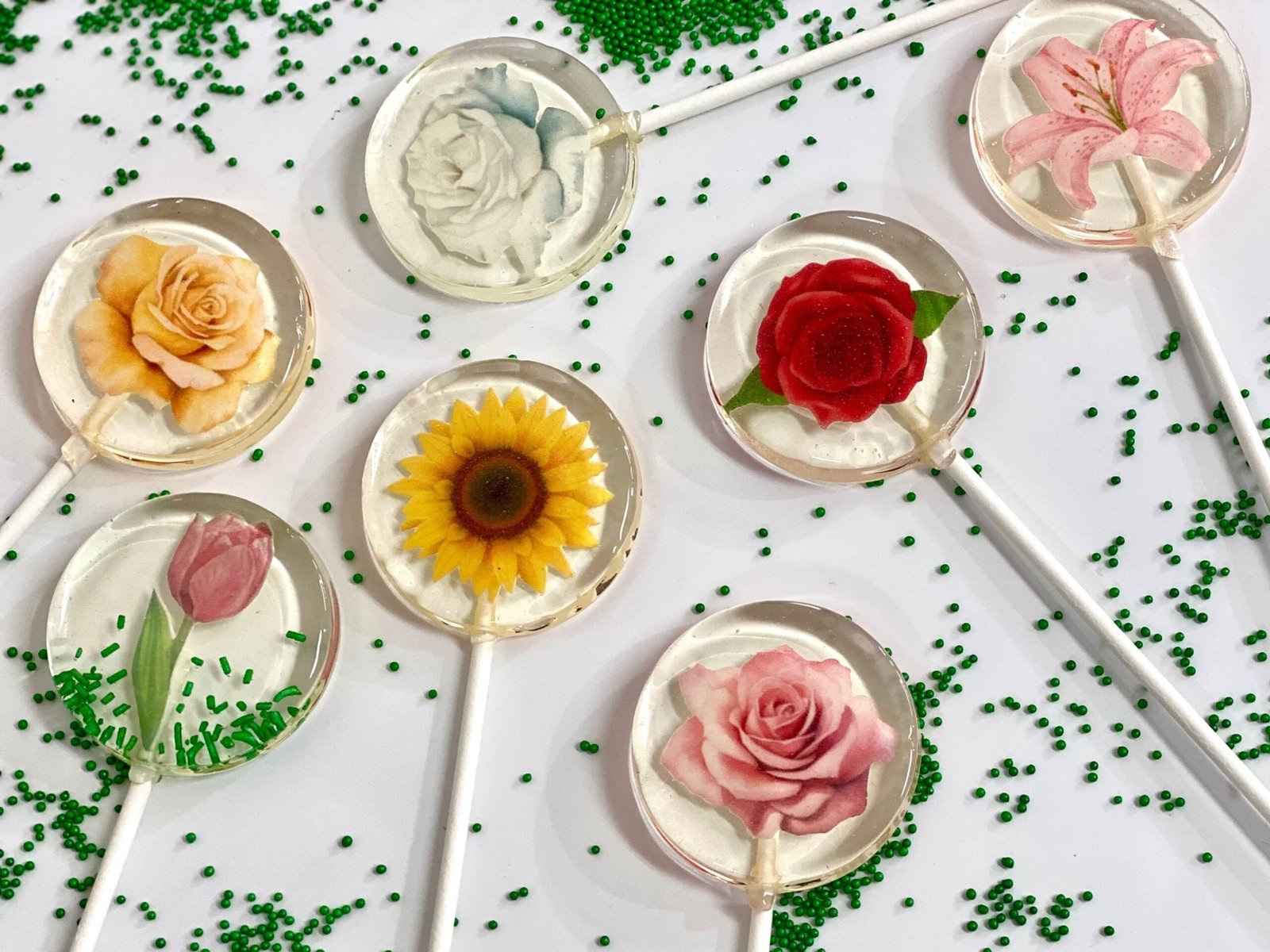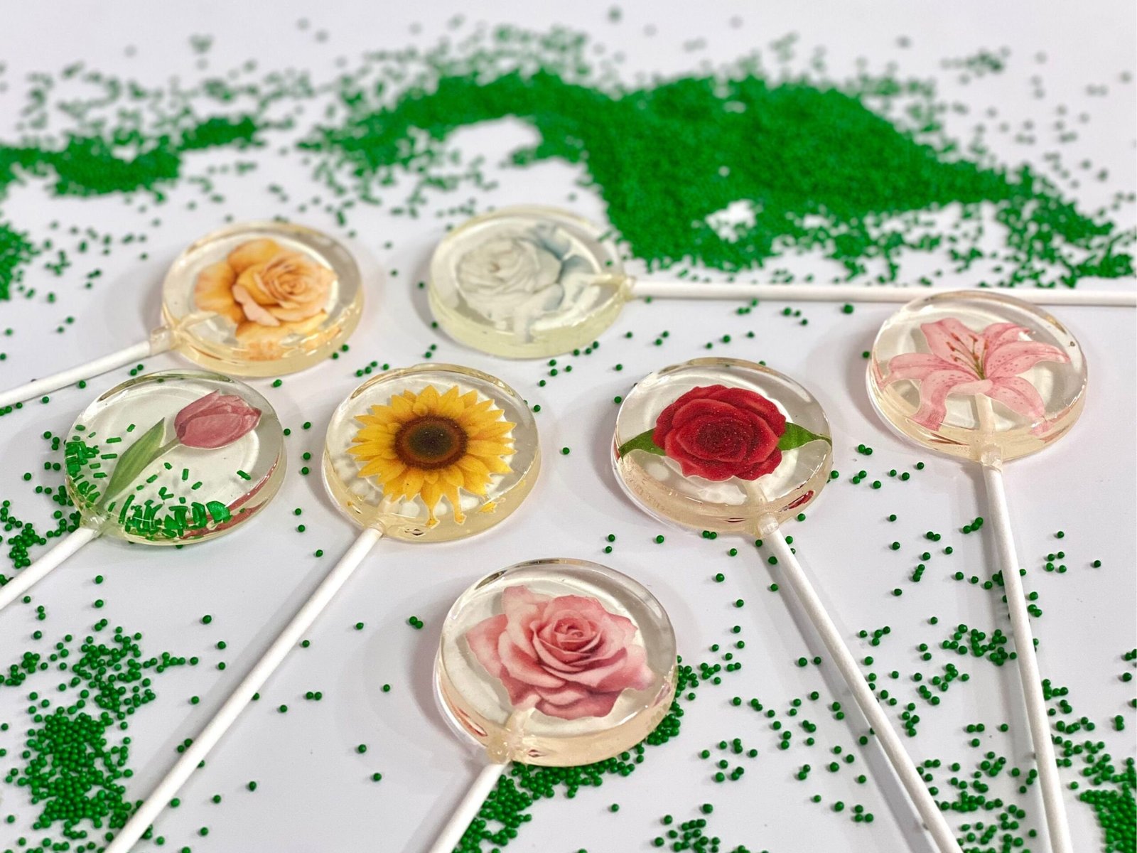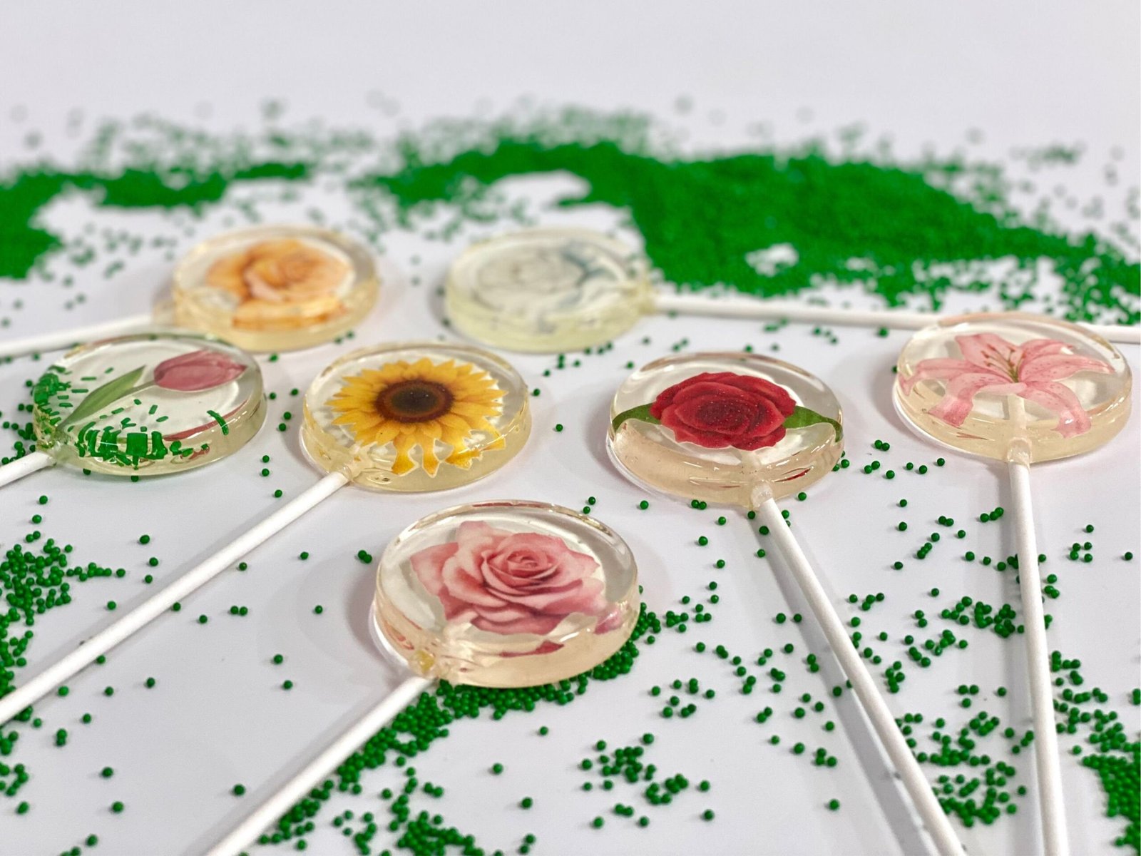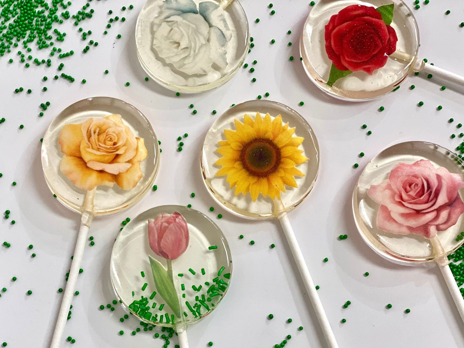 Con una deliciosa variedad de flores comestibles impresas con tinta que incluyen rosas, lirios, girasoles y tulipanes, cada paleta es una celebración de la belleza floral y el sabor delicioso.