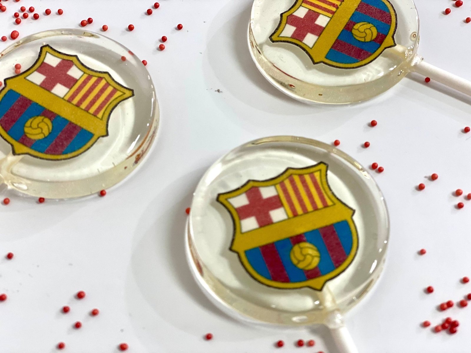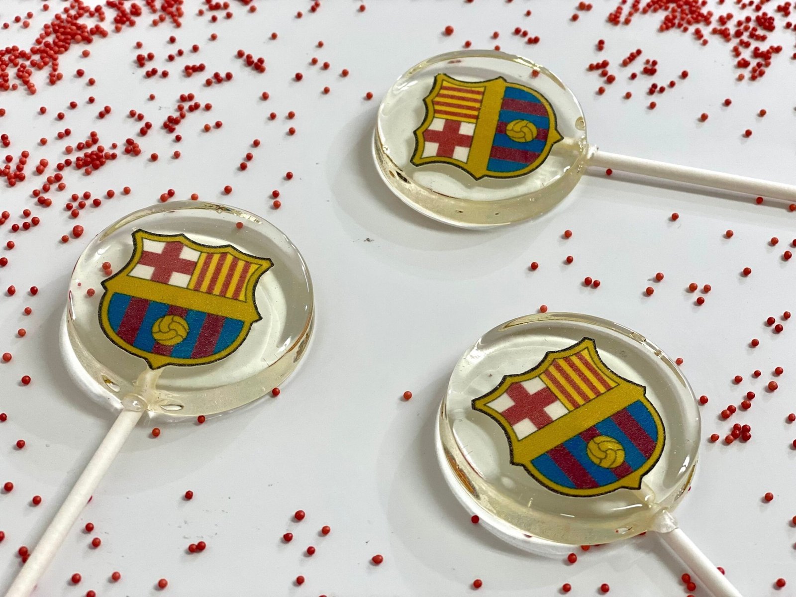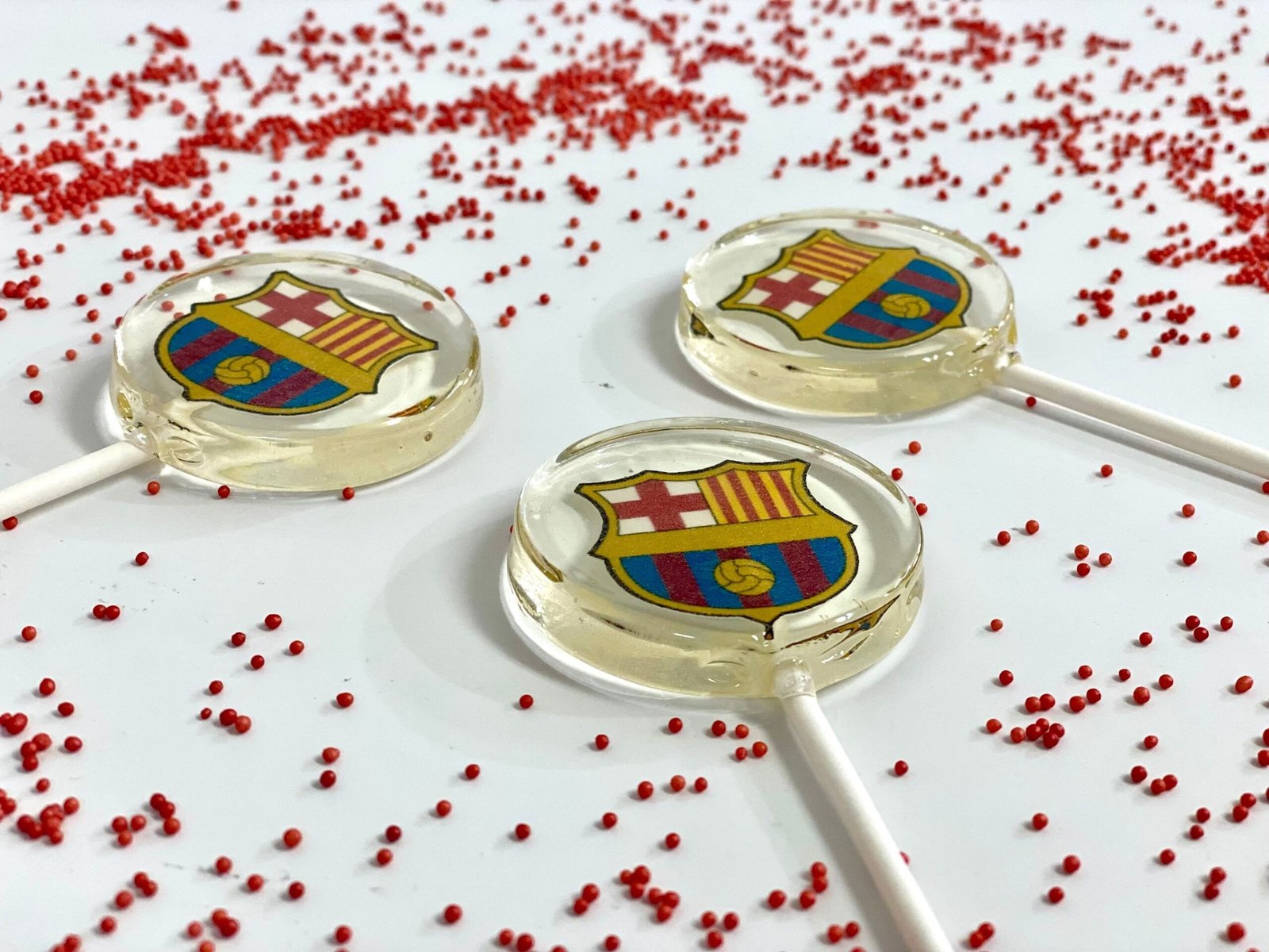Muestra tu apoyo a tu equipo favorito con un encantador logo del FC Barcelona en forma de piruleta.