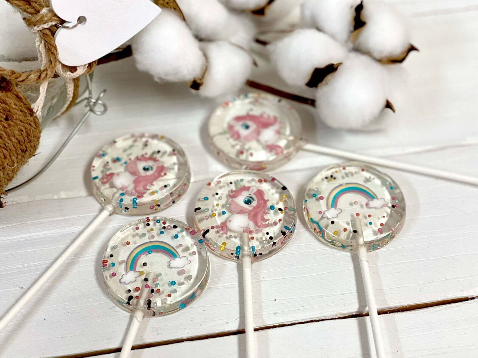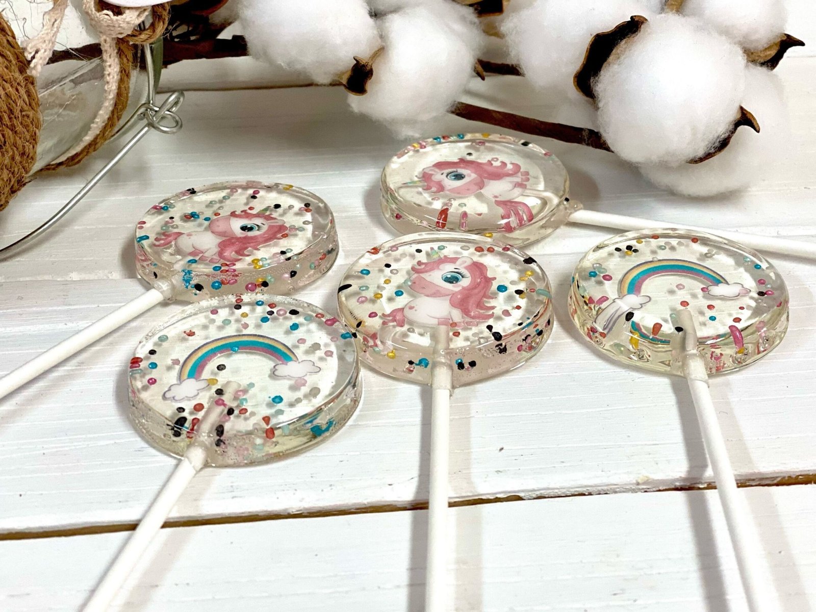 Piruletas personalizadas de unicornio y arcoíris, caramelos duros hechos a mano