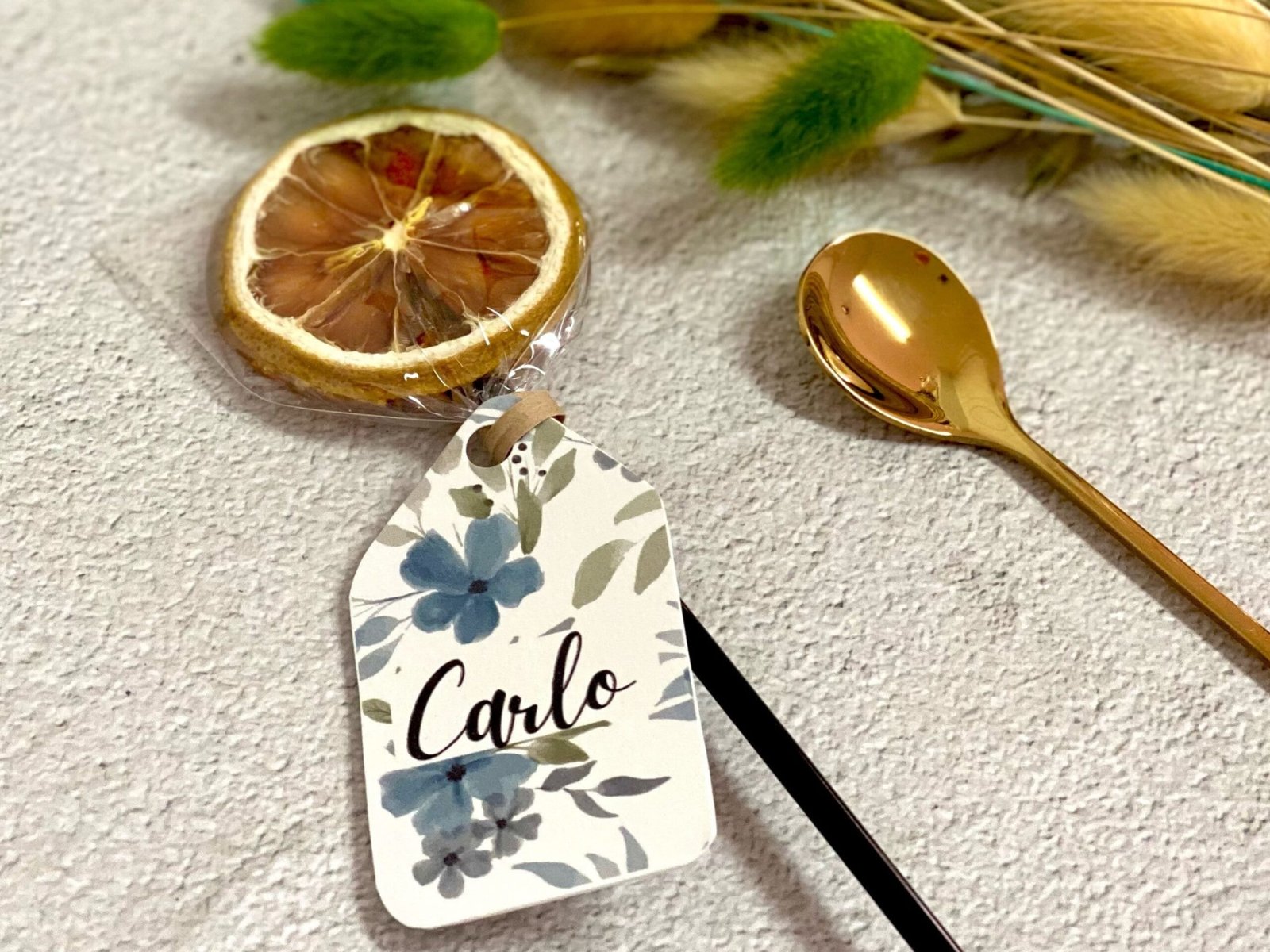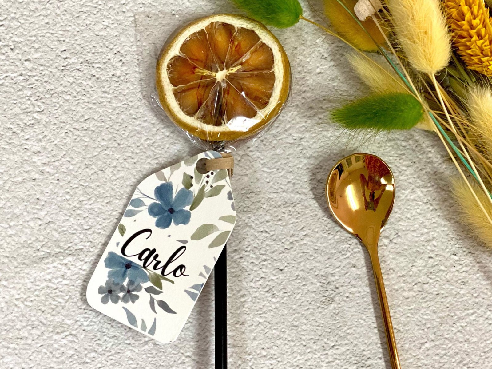 Cada piruleta está personalizada con el nombre de cada invitado a la boda para indicar dónde deben sentarse, y pueden usar la piruleta en su cóctel para realzar su sabor.