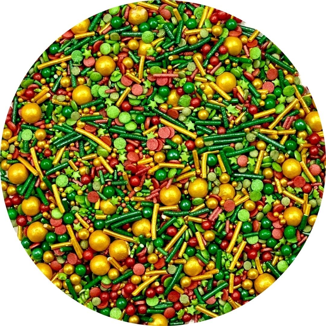 El Sprinkle Mix Christmas es una combinación de tonos rojos, verdes y dorados. Contiene fideos de azúcar, perlas, confetti y estrellas de azúcar.