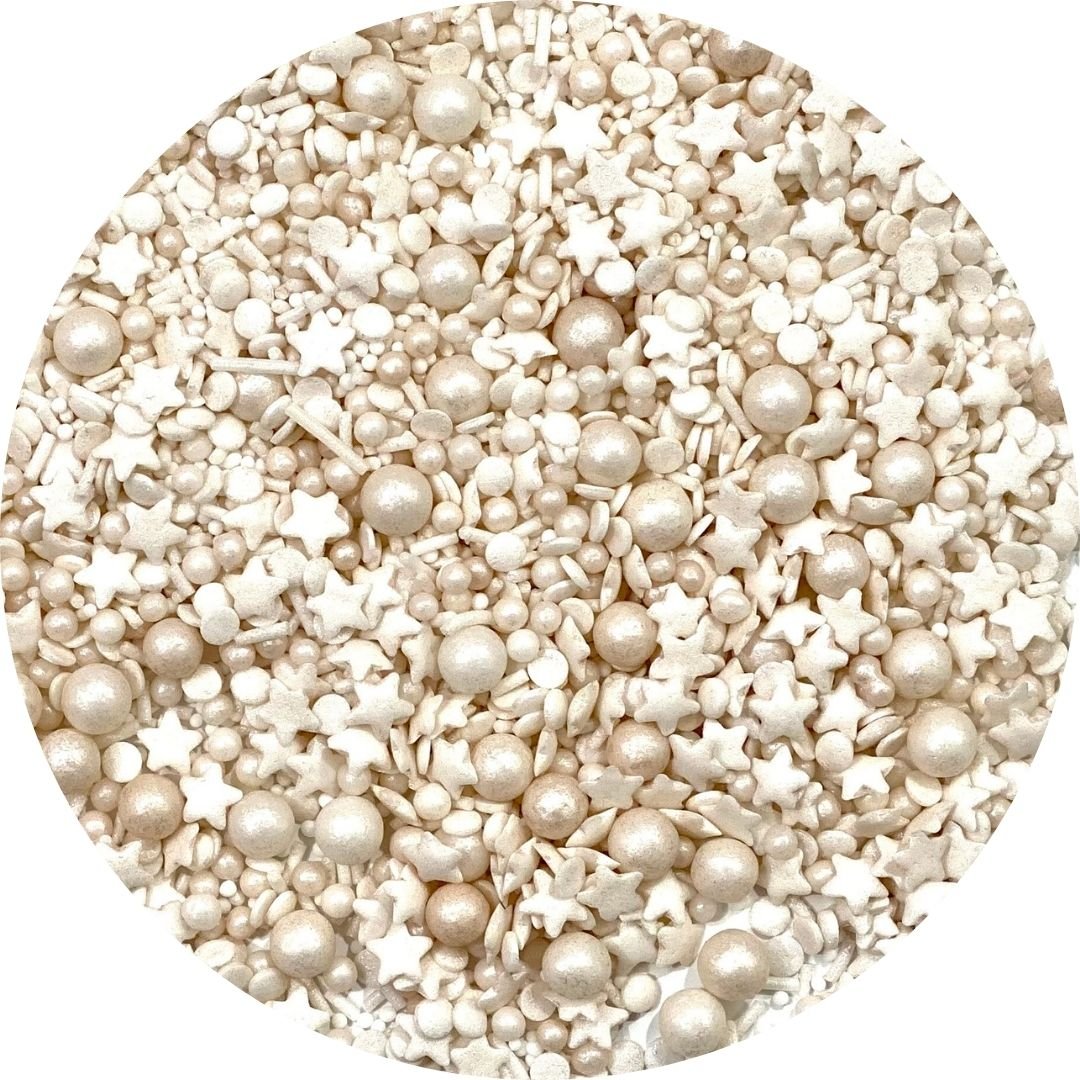 El Sprinkle Mix White es una combinación de sprinkles de color blanco. Contiene estrellas de azúcar, confetti, fideos de azúcar y perlas.
