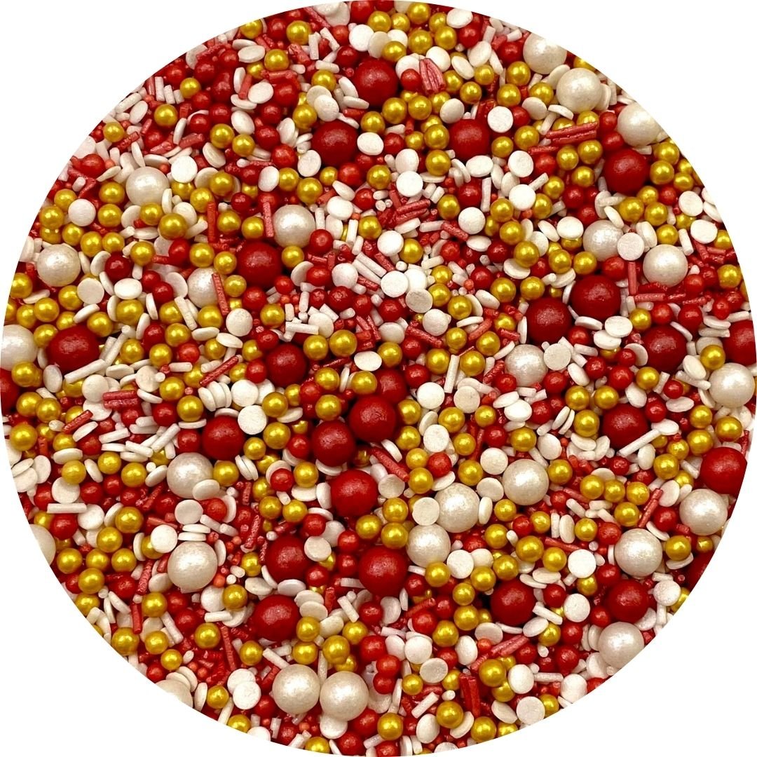 El Sprinkle Terciopelo es una combinación de sprinkles de color rojo, blanco y dorado. Contiene fideos de azúcar, confetti y perlas.