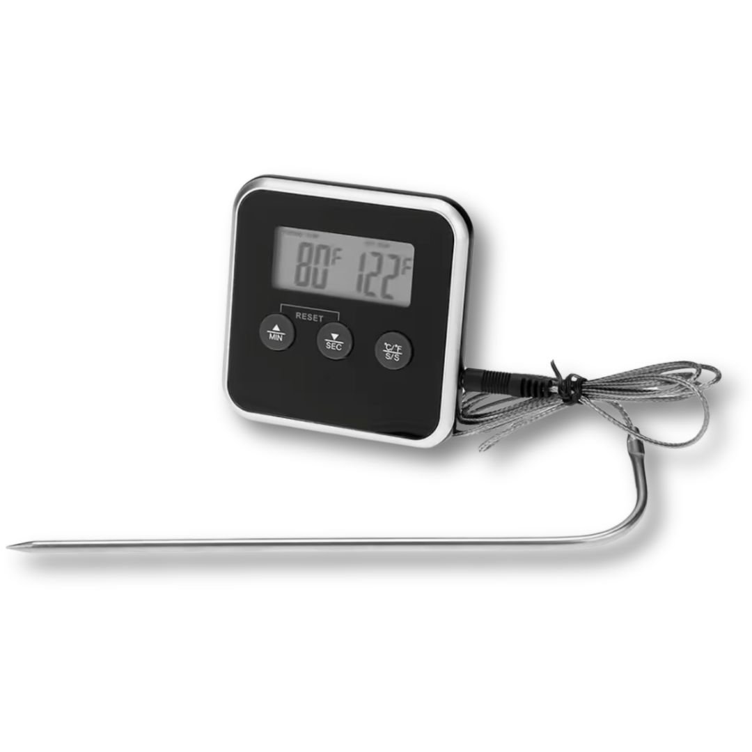 Termómetro electrónico digital con temporizador y medidor de temperatura con sonda remota.
